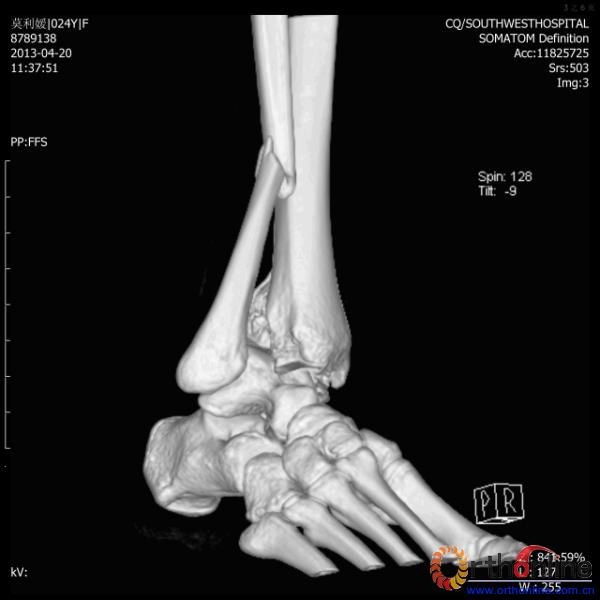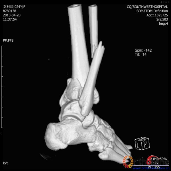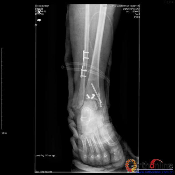 伤员和家属迅速赶到西南医院,10点关节外科段小军副教授查看伤员后急诊收入院,拍摄X片和急诊行三维CT重建检查,提示踝关节创伤严重,出现三踝骨折伴胫距关节脱位,需要急诊手术治疗。随后段教授与正在四川成都参加“汶川地震5周年灾害医学救治研讨会”的杨柳主任联系,进一步完善救治方案。地震当晚,段教授为该伤员进行急诊手术,手术顺利对复杂骨折进行了解剖复位,有效的钢板螺钉固定。术后伤员的疼痛明显缓解,复查X片,踝关节结构恢复满意。