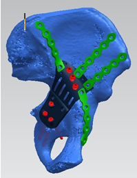 复合型髋臼骨折是较严重而复杂的关节内骨折,主要发生于青壮年的高能量损伤,其疗效及预后与复位固定质量密切相关。特别是涉及包括髋臼四边体的各种类型骨折,手术时要求尽可能解剖复位,早期功能锻炼,以减少远期并发症的发生。但对于复杂的髋臼骨折,尤其是涉及臼顶区、髋臼四边体的粉碎性骨折,由于髋臼的臼顶部、内壁较薄并邻近股骨头,极大限制了在这一区域内使用的内固定类型。 常用的平行于四边体的螺钉放置较为困难,易误入关节腔或盆腔, 即使达到解剖复位,远期也有可能复位丧失。 因此,设计符合局部解剖又利于医师术中操作的内固定物极为重要。