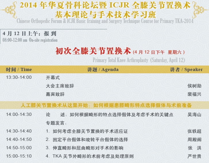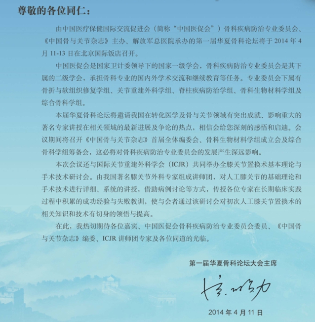 第一届华夏骨科论坛 暨《中国骨与关节杂志》首届全体编委会议 中国医疗保健国际交流促进会骨科疾病防治专业委员会骨科生物材料学组成立会 ICJR全膝关节置换术基本理论与手术技术研讨会