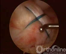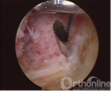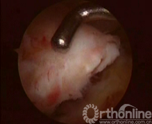 患者取仰卧患膝屈曲90°位,连续硬膜外麻醉,患肢大腿根部上气囊止血带,70Kpa,重力关节灌洗液悬挂在高于术膝1.2m处,常规前内、前外侧入路置入关节镜及工具。行关节镜常规入路清除关节内积血及凝血块,确诊交叉韧带撕脱骨折,处理半月板等其他损伤,仔细清理骨床及撕脱骨块。胫骨髁间隆突前区的骨折,应仔细清除血凝块及游离碎骨块,用关节镜刮勺略加深胫骨侧骨创面(图1)。陈旧性骨折不愈合的病例需使骨折面的两面新鲜化。撕脱骨片已前翘畸形愈合的病例需使愈合的后端再骨折并使创面新鲜化。