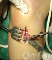 对于单纯的胫骨平台塌陷骨折在固定胫骨髁间隆起骨折之前应在关节镜及C型臂X光线机监视下行复位植骨胫骨平台固定术。某些陈旧性撕脱骨折由于韧带已挛缩难以复位,可行韧带重建术。对于骨块较小或难以固定的粉碎骨折也应行重建术对于合并侧副韧带损伤的患者应做修补术或重建术。半月板等其他关节内损伤需同时处理,此种情况下手术时间可能延长较多,需注意止血带麻痹。