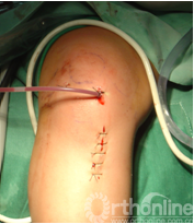 上述方法缝线一直在关节外打结,这可能造成收紧的缝线松弛,造成复位欠佳或者失败。在我们的研究中将固定线捆绑于与胫骨近端成锐角且未拧紧的带垫片的螺钉上,在拧紧螺钉的同时也拉紧了固定线,且拉力强大,可超过用手打结的张力。防止了打结不紧而造成的固定失败或重新固定。也可防止打结后固定线陷入胫骨骨内造成松动而引起固定失败。可能的缺点是螺钉预留过多拧紧时造成固定线拉断。我们选用6.5mm的松质骨半螺纹螺钉加垫片,预留的长度以2-3个螺距为妥。拧紧螺钉时需用探针感知线绷紧的程度,适可而止,以防断线。半螺纹螺钉的优点是不会切割线,骨折愈合后即可门诊手术取出螺钉,及方便又经济。