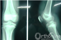 术后肢体由膝关节卡盘可调支具伸膝位固定。一天后拨引流管,被动活动髌股关节以防粘连,直腿抬高锻炼股四头肌。卡盘支具固定2周后放开卡盘膝关节做主动伸屈活动,活动范围逐步增加到0~90°。拄双腋杖患肢免负重行走6周,6周后逐步负重,此时卡盘伸屈限制解除。12周完全负重,去支具。每1~2月来院复查,摄片并指导功能锻炼,术后半年门诊手术取出螺钉。