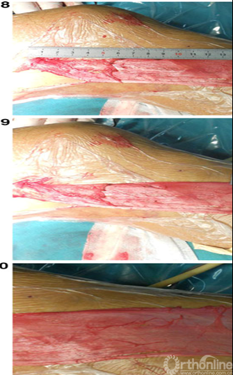 A strip of iliotibial tract(approximately 3.5–4.0 cm wide and 25–30 cm long) was dissected fromthe upper 1/3 thigh, keeping the other end of this strip connected with the endof tibia, namely the Gerdy tubercle. This strip of iliotibial tract was thenrolled and sutured to form a column (see Figs. 1, 2, 3, 4, 5, 6, 7, 8, 9, 10,11).