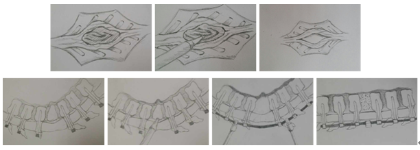 图1 脊髓纵裂切除及截骨示意图 a 显露骨性纵隔 b切除骨性纵隔 c 骨性纵隔完全切除 d 显露顶椎椎体 e 凸侧行截骨术 f顶椎区完成截骨 g闭合截骨间隙完成矫形术。(第一行自左向右a、b、c,第二行自左向右d、e、f、g)