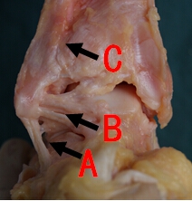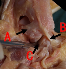 A:跟腓韧带;B:距腓后韧带;C:下胫腓联合韧带后部