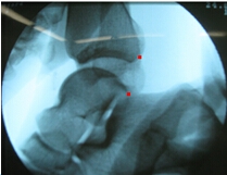 A:操作手法;B:摄片阳性,红点分别代表胫骨和距骨后缘