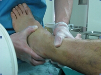 图3 左外踝韧带断裂后,应力位时,皮肤凹陷征阳性