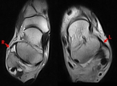 R示右ATFL从腓骨止点完全撕脱,L示正常ATFL全长,此时舟骨恰呈“哑铃状”形态