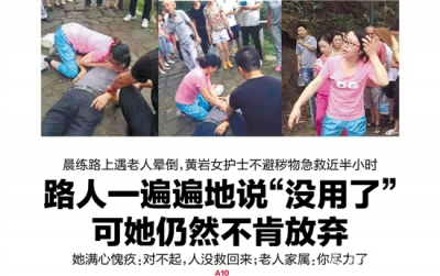 前几日,本报报道了一则护士救人的感人消息。台州第一人民医院护士王丹萍近日在晨练路上遇见一名老人晕倒,她不避秽物,给老人做人工呼吸,急救近半小时。路人一遍遍地说“没用了”,她仍然不肯放弃。尽管最终没能挽回老人的生命,王丹萍的义举仍赢得了人们的赞美。