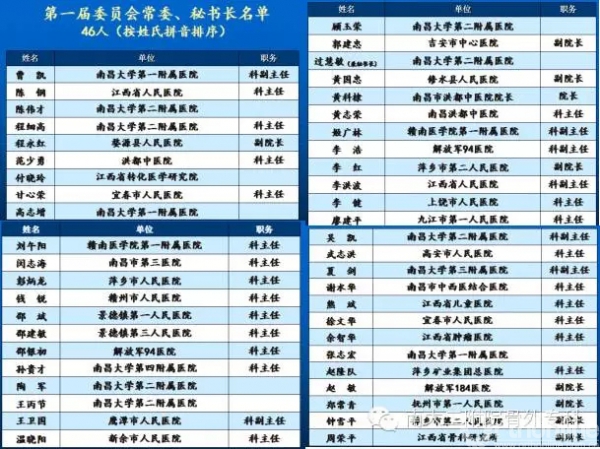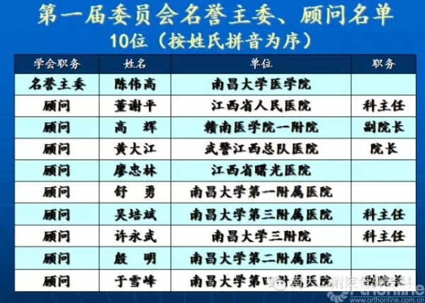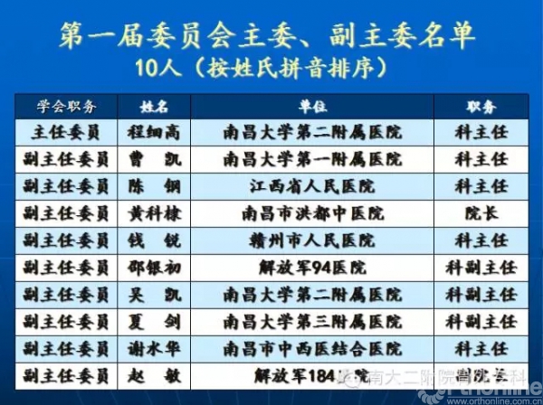 2016年1月15日,江西省研究型医院学会骨科学分会及十大亚专业组成立大会在南昌隆重召开,会上选举了南昌大学二附院骨科主任、江西省骨科研究所所长程细高担任第一届骨科学分会主任委员,曹凯、陈钢、黄科棣、钱锐、邵银初、吴凯、夏剑、谢水华、赵敏共9人担任副主任委员,陈伟高任名誉主委,董谢平、高辉、黄大江、廖忠林、舒勇、吴培斌、许永武、殷明、于雪峰共9人担任顾问,同时会上还公布了46位骨科学分会常务委员及十大亚专业学组委员共计365位委员名单,所有委员以亚专业学组形式入会,委员会任期4年。