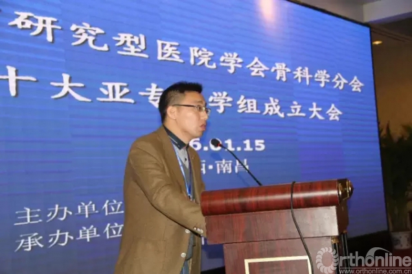 骨科学分会第一届主任委员程细高上台做了《江西省研究型医院学会骨科学分会及十大亚专业组成立筹备工作》报告并发表精彩演讲:为了适应全国骨科各亚专业学科发展的需求,加强我省骨科与国内同行的交流与合作,促进我省骨科各亚专业组与国内相关学组的接轨,江西省研究型医院学会骨科学分会及十大亚专业学组(脊柱学组、脊柱微创学组、关节学组、创伤学组、修复重建学组、关节镜学组、肿瘤学组、儿童骨科学组、青年学组及基础学组)的成立势在必行。骨科学分会及十大亚专业学组的成立并不是一个排资论辈的组织,而是纯为全省骨科同道服务的一个学术性组织,目的是为江西省骨科同仁间的交流提供更好的平台,推进技术改革创新,促进科研发展,同时凝聚所有骨科人的力量,为我省骨科事业的发展推波助澜,以达到造福全省广大百姓的目的。程细高会长对学会精神的阐述和对江西省骨科事业发展的期望感动了在场的所有通道,收获热烈的掌声。