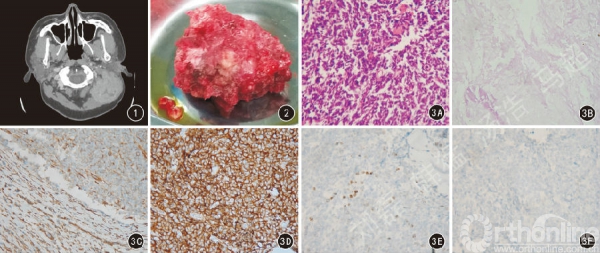 图1 术前患者颅脑CT,提示左枕骨区占位病变 图2 患者术中切下瘤体组织的肉眼观 图3 术后病理检查 3A HE 染色阳性(x400)3B PAS染色部分阳性(x400) 3B PAS 染色部分阳性(x400) 3C Vim 阳性 3D CD99 阳性 3E 20% 细胞Ki67 阳性 3F S-100阴性 图3C~3F 为免疫组织化学染色