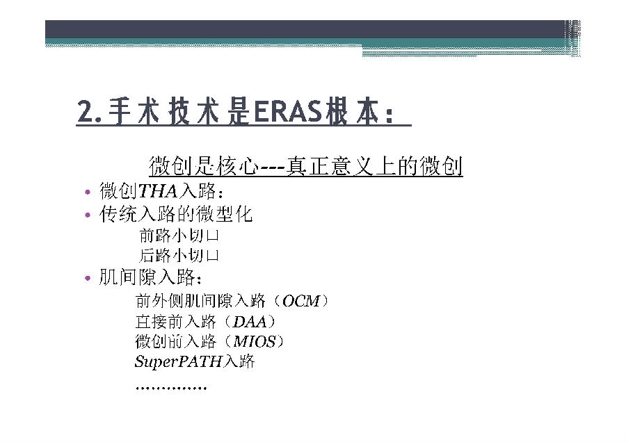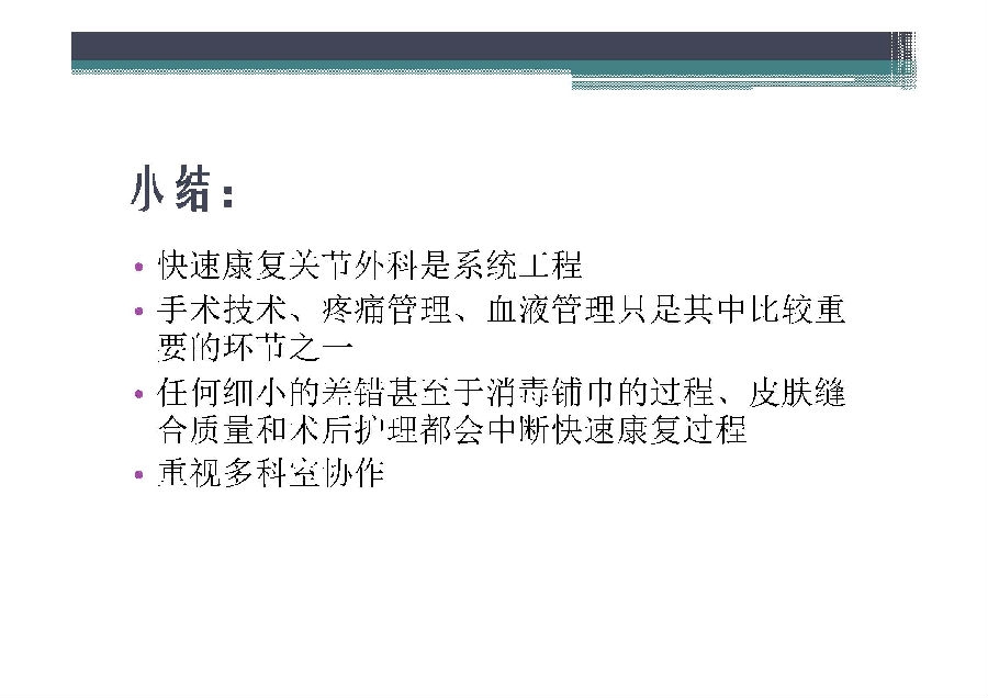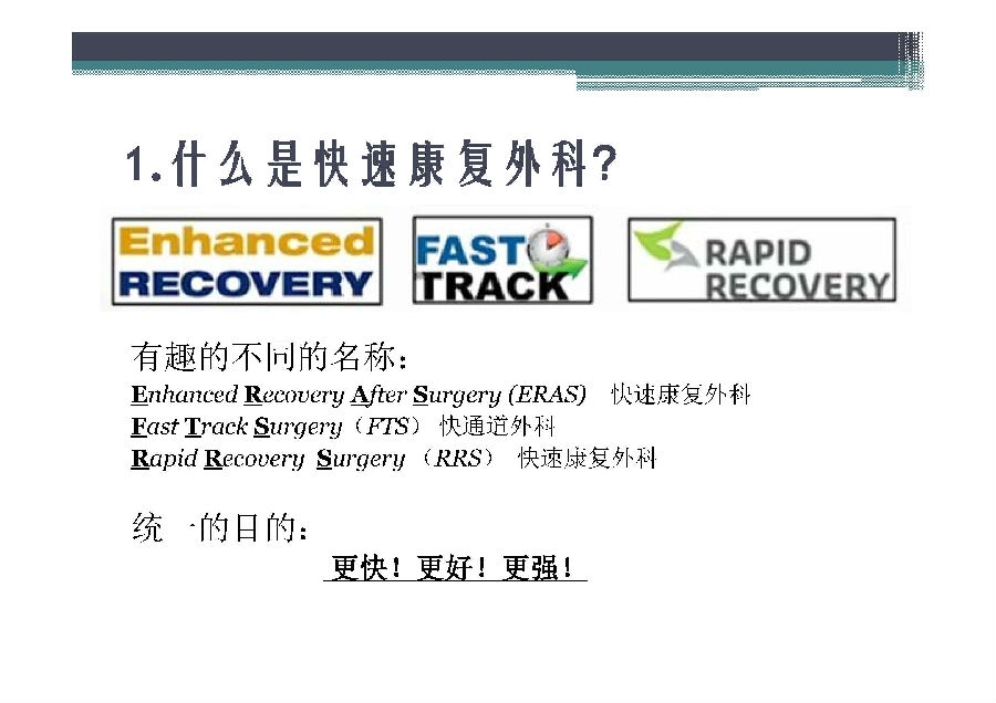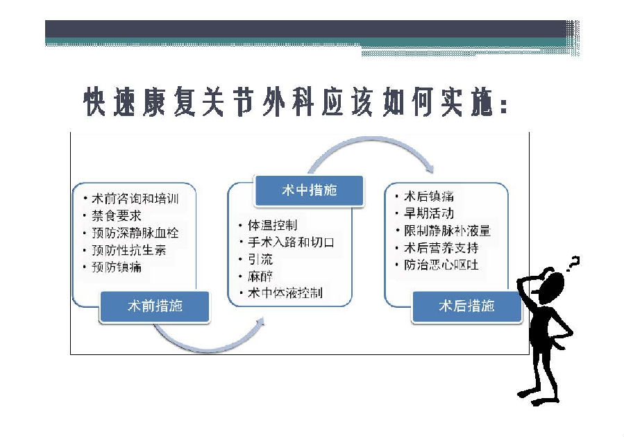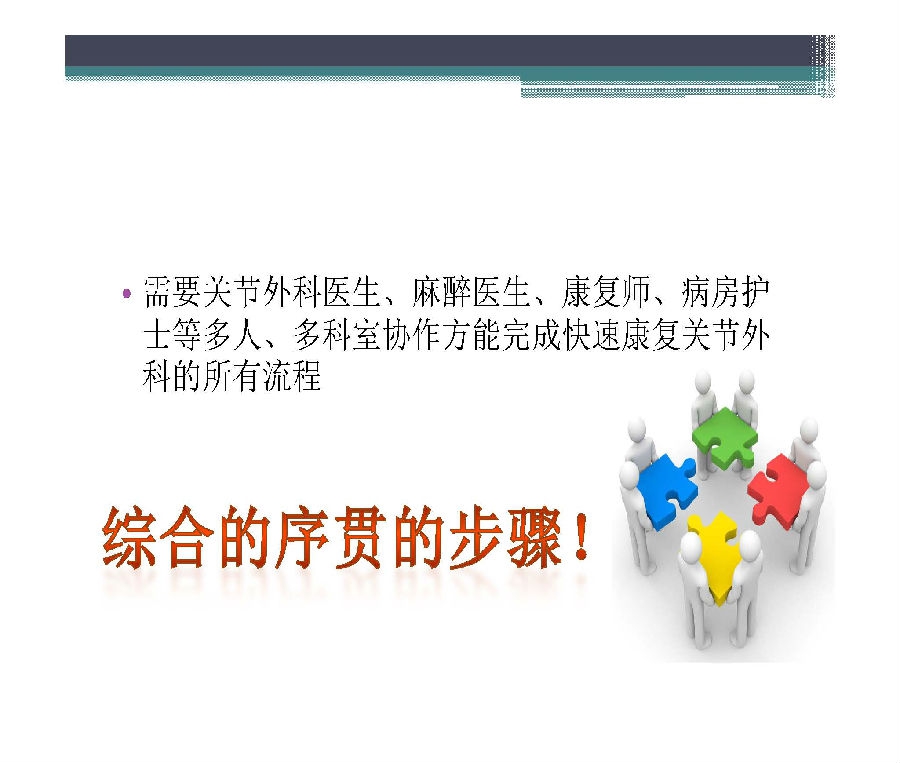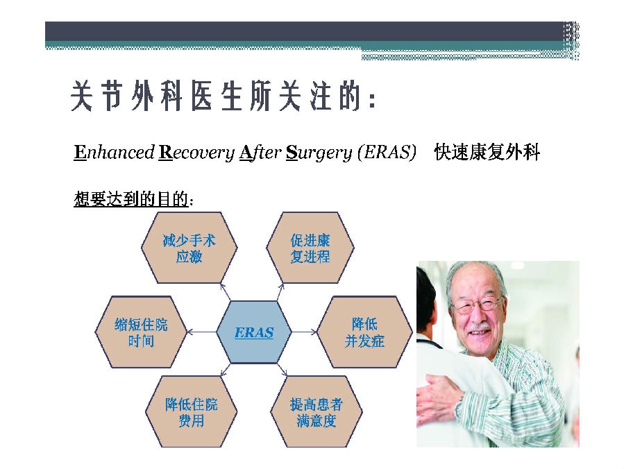 快速康复外科理念于上世纪90年代由丹麦医生提出,其核心是在围术期应用各种已被证实有效的方法以减少患者的手术应激反应和并发症,缩短住院时间,提高患者满意度,减少住院费用。国外骨科引入快速康复理念已经比较成熟,国内骨科快速康复开始相对较晚,对于中国骨科医生来说也是一个新的领域。