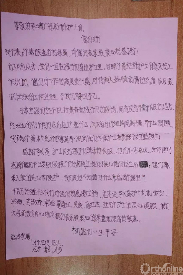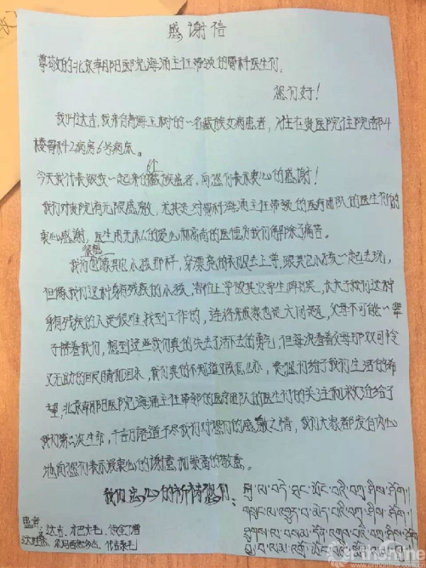 近日,首都医科大学附属北京朝阳医院骨科海涌教授团队又收到十余名名藏族患儿和家属联名写的感谢信、敬献的哈达和锦旗,这些从此可以摆脱人们歧视并挺直脊梁成长的孩子,他们通过工整又偶有错别字的感谢信表达了对海涌教授团队最真挚的谢意和感恩。这种场景在海涌教授团队时常出现,因为从2006年至今,该团队已陆续通过手术赋予177名贫困脊柱侧弯儿童健康成长的希望和可能。