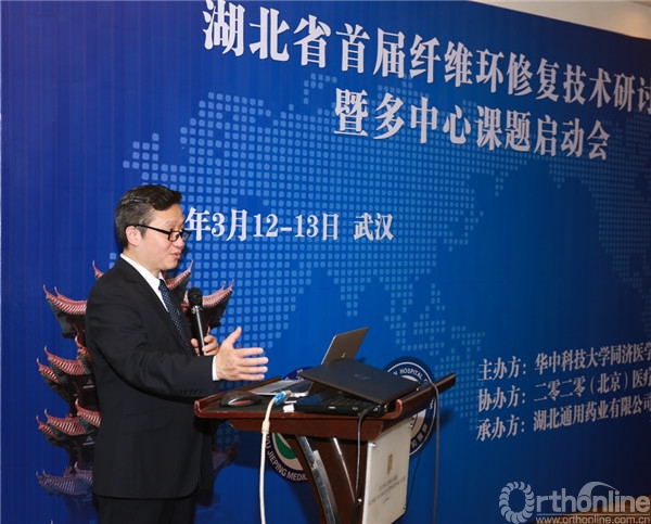 湖北省首届纤维环修复研讨会暨多中心课题启动会于2016年3月13日在武汉召开。首先,由大会主席、武汉协和医院骨科医院主任邵增务教授致欢迎辞。邵教授对本次会议的主讲专家,第三军医大学新桥医院骨科主任、中华医学会骨科学分会常委、国际脊柱微创外科学会副主席及候任主席周跃教授表示热烈欢迎。邵教授在致辞中谈到,全世界每年接受髓核摘除手术的患者人数达到60-80万人,其中约10%-15%可能复发,复发最主要的原因是(椎间盘)再突出。围绕再突出,国际上采取了很多办法,包括填充物(如人工髓核)、屏障技术、组织再生技术(目前以实验室研究为主)以及以缝合为代表的加固技术。