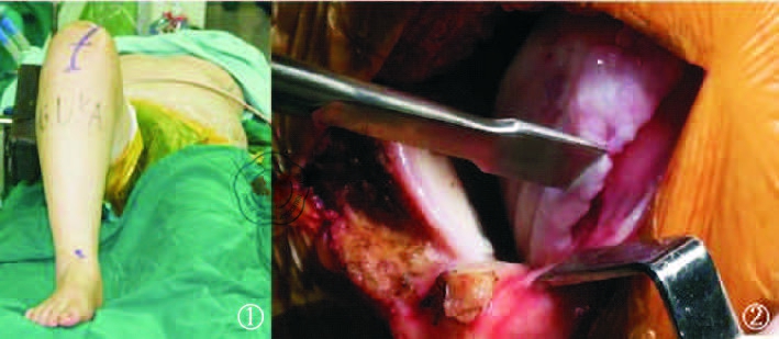 图1 体位及切口 图2 去除内侧缘及髁间窝骨赘