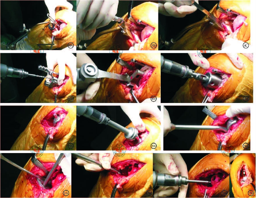 图6A 开龙骨槽; 图6B 修整龙骨槽图7 骨水泥固定。图7A 截骨面钻孔; 图7B 假体安装