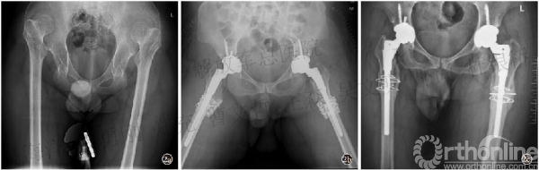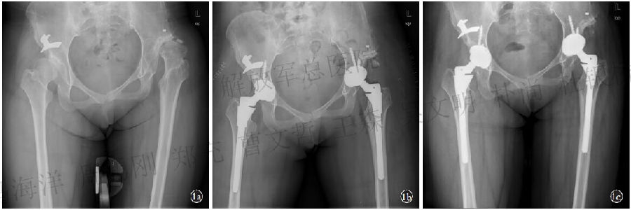 1a.术前X 线片 1b.双髋置换术后X线片 1c.术后21个月复查X线片示髋关节功能良好,假体位置良好