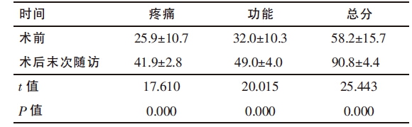 表2 两组Crowe Ⅳ型髋关节发育不良患者术前及末次随访Harris 评分比较(