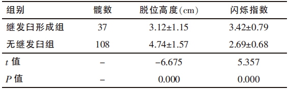 表4 两组Crowe Ⅳ型髋关节发育不良患者髋关节脱位高度和髓腔闪烁指数比较(