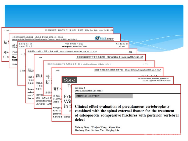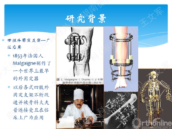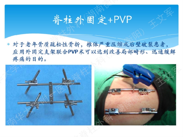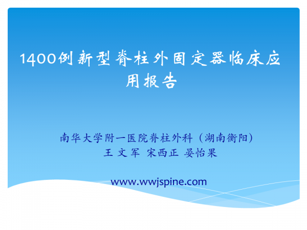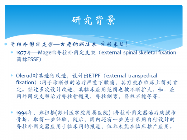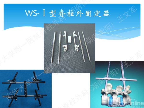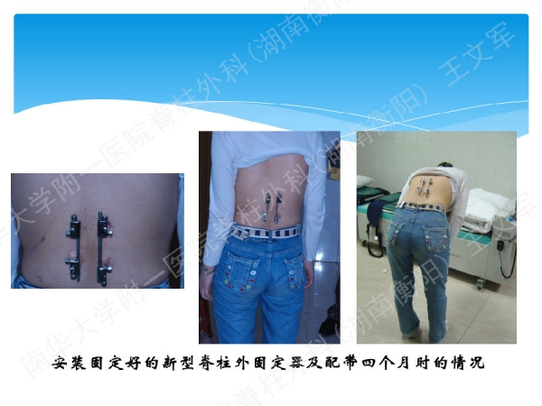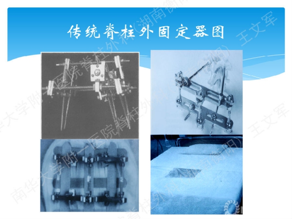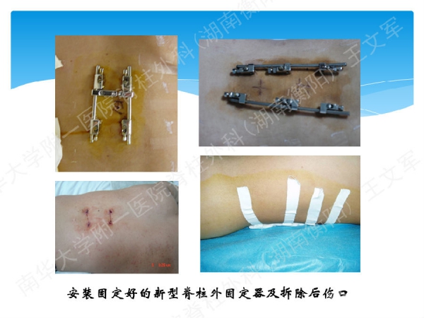 2004年,以南华大学附属第一医院脊柱外科王文军教授和宋西正博士为主的团队,根据Magerl脊柱外固定器的原理,克服传统脊柱外固定器的缺点,自行研制和开发了一套新型脊柱外固定器,并率先采用联合椎间盘镜下椎管减压技术,成功实现了全程微创治疗胸腰椎骨折的目的。