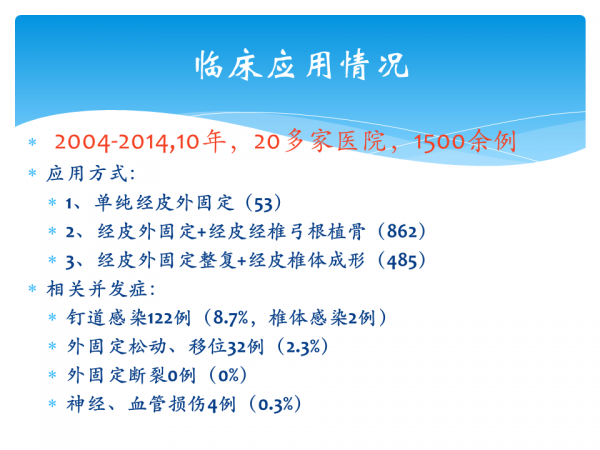 目前,该技术已在全国二十多家教学医院和技术协作医院推广应用1400多例,临床疗效反映良好。其他应用该技术治疗脊柱侧弯、脊柱结核、脊柱滑脱等多种脊柱疾病的临床研究也在进行当中,具有较大的临床推广应用价值。