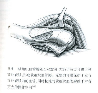 解决方法是在大转子截骨后,继续在截骨面的后上 1/3 斜行切骨,行外旋肌在大转子后方附丽点的骨膜下剥离,保持骨膜组织和外旋肌附丽的完整性,骨膜的完整保护了穿行血管的完整,外旋肌脱离骨性附丽使其移动幅度大大增加(图 6)。