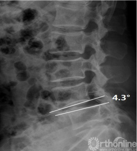 (2)椎体间角度变化值:测量过屈、过伸侧位片滑脱节段上位椎体下终板与下位椎体上终板间成角,并计算其差值。(图2)