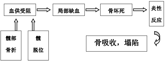 ONFH病理发展的关键在于股骨头的塌陷,推测其病理生理的特点:股骨头血供受损→破骨细胞活跃,成骨细胞凋亡→骨坏死→骨修复启动→新生血管向病损区长入→成骨细胞活跃→新骨形成→病损外周新骨密度及厚度逐渐增加→形成屏障→阻止血管继续侵入→骨修复进程中断→坏死区中心囊性改变,小梁骨脆弱→股骨头塌陷。