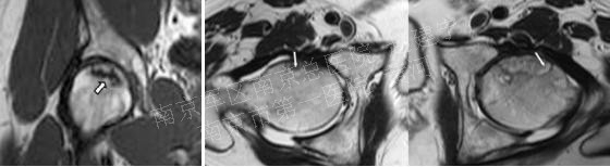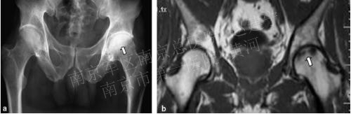 平片中可见软骨下骨硬化,边缘不清;T-1 W则可清晰显示病损范围
