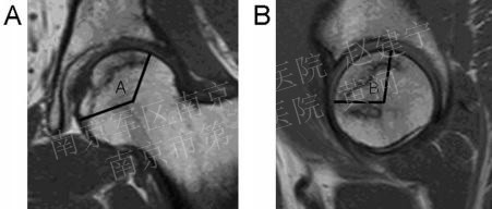 预后的判断:病损区体积的大小是判断ONFH预后的重要参数,基于髋关节MR之上的改良Kerboul测量法在临床上应用的较为广泛,A与B之和(联合坏死角)如大于200°,通常预示着股骨头的塌陷及病情的进展。