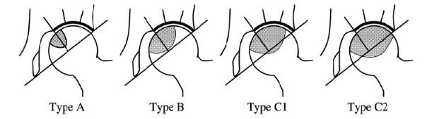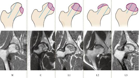 A型:病损只占负重区的1/3;B型:病损占负重区2/3;C1和C2型病损均超过负重区2/3以上,C2型病损更延至股骨头外侧区。所谓负重区即指通过髋臼缘及泪滴底部连线的垂直中线以外的区域。