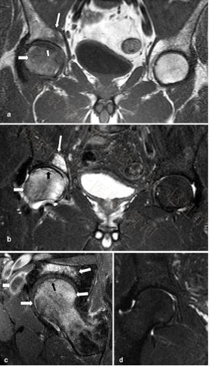 58岁男性。(a, b) T1-W及T1快速翻转恢复图像(STIR)均可见右侧股骨头内弥漫性的骨髓水肿(粗箭头),同时软骨下可见线性的低信号(小箭头),甚至髋臼区亦可见骨髓水肿信号(细长箭头)。(c) 脂肪增强抑制T1-W自旋回波图像(SE)显示股骨头及髋臼弥漫性骨髓水肿信号(箭头),软骨下线性改变(黑箭头)以及髂腰肌滑囊炎性改变信号(粗箭头)。(d) 11个月后T1 STIR图像见骨髓水肿区已完全消失。