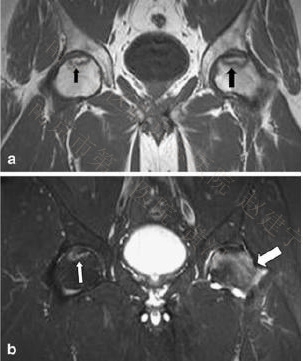 45岁,长期服用皮质类固醇激素,左髋疼痛2月。T1-W(a)及脂肪抑制T2-W像(b)均可见左髋股骨头内有典型的条带状信号(粗黑箭头)以及弥漫性的骨髓水肿(粗白箭头);在无症状的右髋中也可见到这一典型的条带状信号(均为细箭头),但并无骨髓水肿改变,表明ONFH尚处于病变的早期阶段。