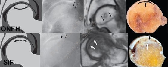 软骨下应力骨折,可以造成股骨头的塌陷,在诊断为ONFH而行髋置换的患者中占5-10%,但ONFH存在不可逆的进展,最终必然造成髋关节永久性的废用,而SIF既可表现出病情进展的特点,引起股骨头的塌陷,但也可随时间推移而完全消退