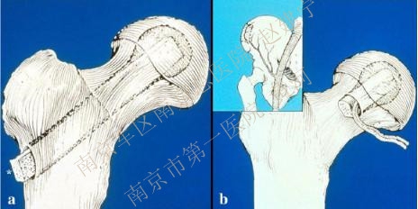 TRO根据股骨轴线将股骨头颈向前方或后方旋转,使坏死区的软骨移出负重区,代之以健康的软骨。旋前或旋后取决于侧位片对坏死区的显示,如坏死位于负重区前方,则采用前方旋转截骨,反之同理。Ikemura报道优良率达80%以上。