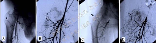A DSA显示旋股外侧动脉穿支;B)DSA显示股骨头供血不足,但旋股外侧动脉穿支状态良好;C)术后DSA显示带有旋股外侧动脉穿支的大粗隆已植入股骨头内;D)DSA显示股骨头内血管再生。