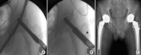 A 逆行取出钽棒;B 环锯沿钽棒扩钻,产生大量金属颗粒(箭头);C 关节置换术后X片显示粗隆骨折,环扎固定。