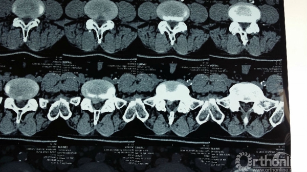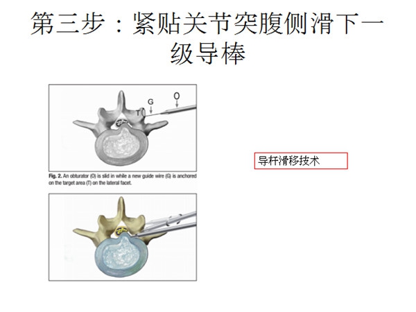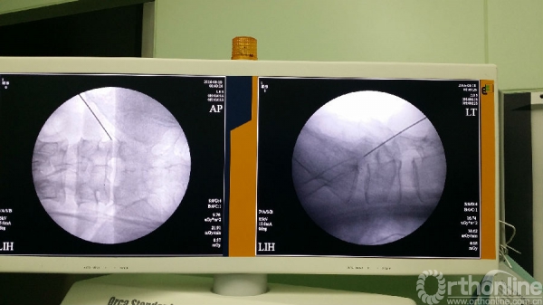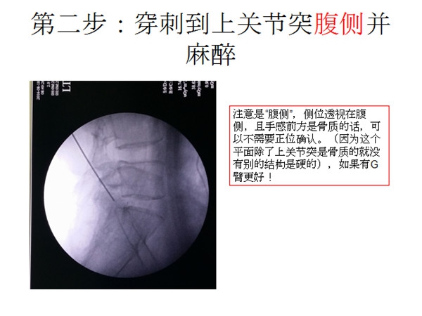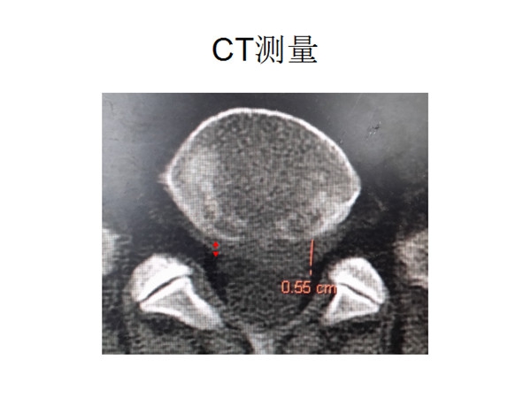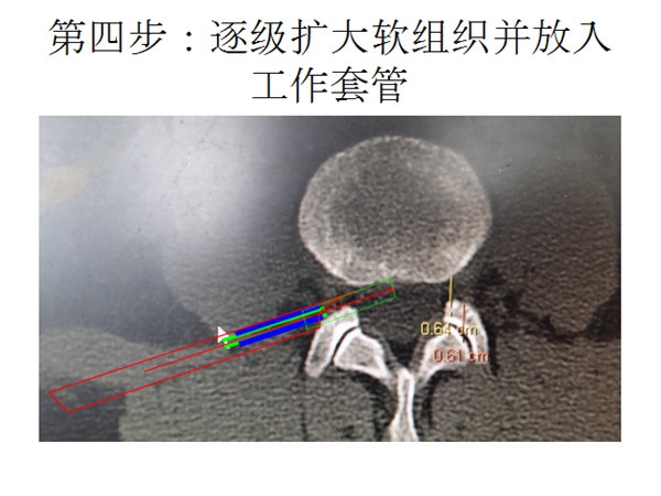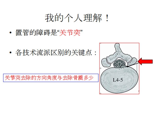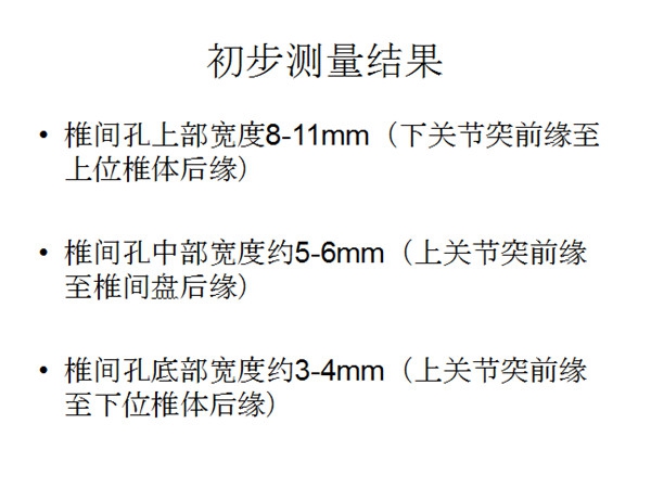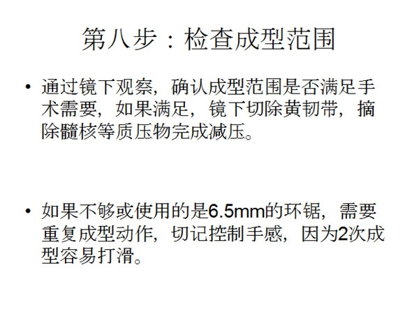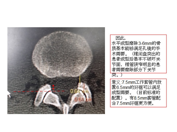 显露关节突是要充分应用射频电极去探查上关节突的尖端,上关节突腹侧边缘,下位椎体椎弓根的上缘,搞清边界,再根据术前的影像学及自己穿刺的头尾倾斜角度评估需要成型的部位及骨质去除的多少,(以少破坏能够解决问题为原则,勿为了更好的显露,盲目过多切除关节突,破坏稳定性)可以选择尖部,体部以及椎弓根上缘成型,成型的厚度也要根据术前评估选择,狭窄的、钙化的、脱垂的、中央巨大的、需要双侧减压的等等需要成型厚度多一些,可以先偏背侧成型,安全一些,此时在腹侧还会有部分骨质残留,可以二次成型,这样比先腹侧再往背侧调整安全(因为可能会滑动),普通的椎间盘突出,磨除4-5mm左右骨质(加上本身4-5mm的空间,根据幻灯中的测量,完全可以水平放置入7.5mm的工作套管在椎管内),基本可以解决问题(如本例患者)。