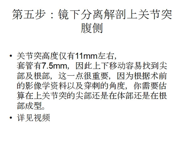 该视频采用的7.5mm套管及6.5mm环锯,镜下找出关节突成型的位置后,助手扶着套管,置入环锯成型,所以视频中有镜头撤出的时间,实际上是在成型。如果有8.5mm套管配合7.5mm环锯,可以将镜头放入环锯内观察,但比较费事,不好发力控制环锯,需要器械改进。