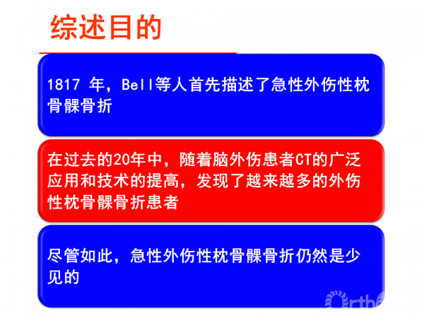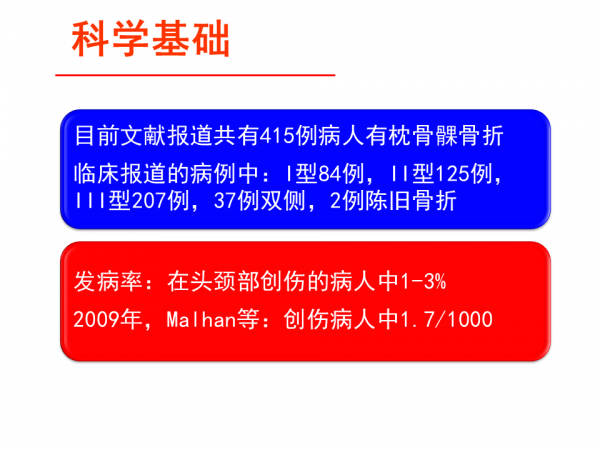 枕颈部是是脊柱解剖结构及生物力学功能最为复杂的区域,在过去的20年中,随着脑外伤患者CT的广泛应用和技术的提高,发现了越来越多的外伤性枕骨髁骨折患者。