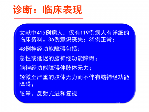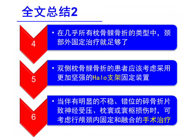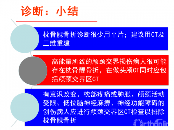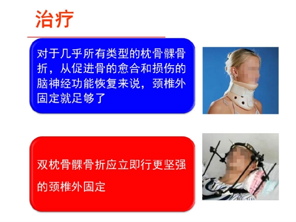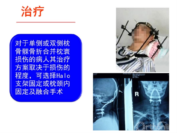 他指出,对于有意识改变、枕部疼痛或肿胀、颅颈活动受限、低位脑神经麻痹、神经功能障碍的创伤病人,应进行颅颈交界区CT检查以排除枕骨髁骨折,确诊患者应进行颈椎外固定,以免发生低位脑神经功能障碍;对于双侧枕骨髁骨折的患者应该考虑采用更加坚强的Halo支架固定装置;当伴有明显的不稳、错位的碎骨折片致神经受压、枕寰或寰枢损伤时,可考虑行颅颈内固定和融合的手术治疗。