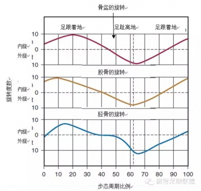 图3步行期间下肢的横向旋转。下肢内旋至步态周期进行到15%,之后发生外旋,到足趾离地后开始重新内旋。
