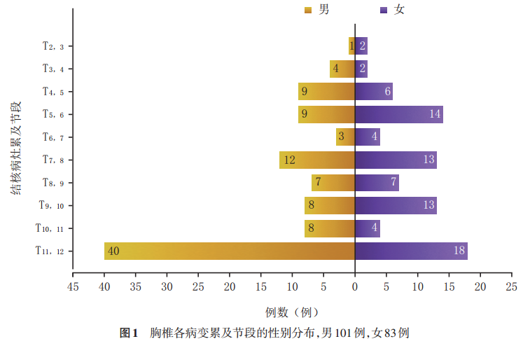2003年1月至2010年11月期间,我科收治胸椎结核患者267例,按上述纳入及排除标准共184例(68.9%)纳入本研究。男101例,女83例;年龄21~62岁,平均(39.3±14.3)岁;病程4~18个月,平均(9.6±5.0)个月。病灶累及节段:T2,3 3例,T3,4 6例,T4,5 15例,T5,6 23例,T6,7 7例,T7,8 25例,T8,9 14例,T9,10 21例,T10,11 12例,T11,12 58例。病灶累及节段的性别分布见图1。