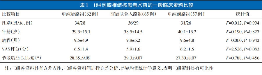 本研究回顾性对比分析单纯后路、单纯前路及前后联合入路治疗胸椎结核患者的5年以上随访资料,目的在于:①对比单纯后路、前后路联合及单纯前路手术治疗胸椎结核的中期疗效;②为单纯后路术式进一步的推广提供更多循证医学的证据。