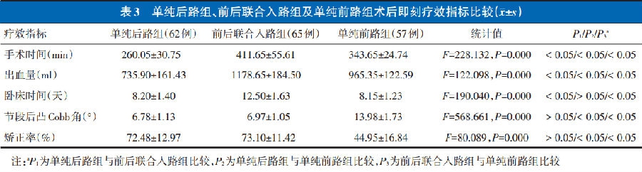 三组手术时间、出血量、节段后凸Cobb角矫正度数及矫正率、卧床时间比较,差异有统计学意义(表3);进一步两两比较,结果显示单纯后路组手术时间、出血量优于前后联合入路组和单纯前路组,单纯后路组和前后联合入路组节段后凸Cobb角矫正度数及后凸角矫正率优于单纯前路组。单纯后路组和单纯前路组卧床时间较前后联合入路组短。