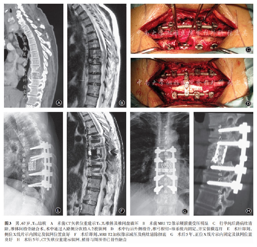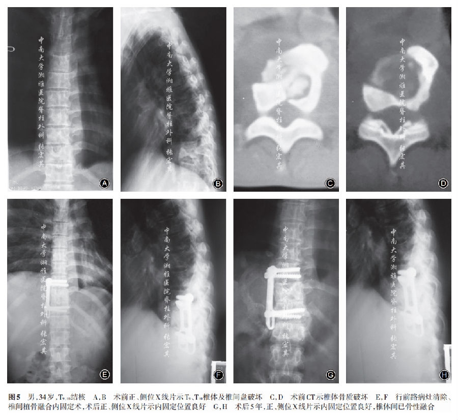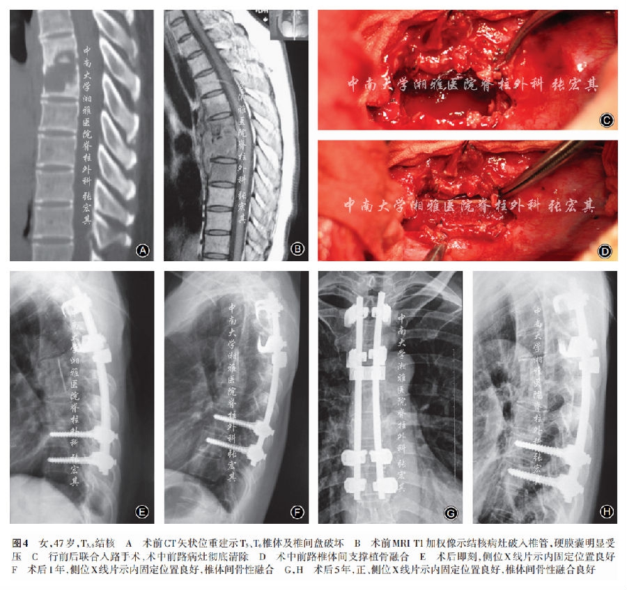 排除标准:①多节段胸椎结核;②合并巨大流注脓肿,椎旁脓肿;③合并活动性肺结核患者,或合并其他结核;④既往有上胸椎手术史者;⑤合并其他胸椎疾病,如黄韧带钙化、椎间盘突出症等;⑥多器官功能障碍,难以耐受手术;⑦随访期间死亡,随访时间不足5年的患者。