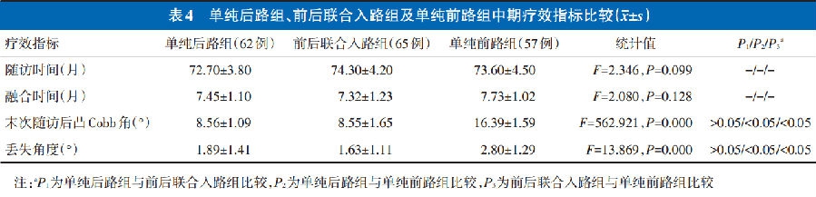 三组末次随访时节段后凸Cobb角及丢失角度比较,差异有统计学意义(表4);进一步两两比较,结果显示单纯后路组和前后联合入路组优于单纯前路组。而三组骨融合时间、末次随访时VAS评分的差异均无统计学意义(表4)。