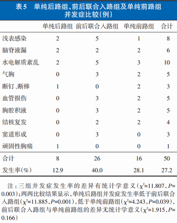 单纯前路组术中前路暴露过程中发生2例血管损伤,2例脑脊液漏,予以修补。术后发生1例浅表感染,3例水电解质紊乱,2例气胸,2例胸腔积液,给予对症处理和胸腔闭式引流后症状缓解。中期随访期间2例出现断钉,翻修手术后达到骨性融合;2例出现结核复发脓肿形成,经再次手术,改变化疗方案后未见复发。并发症发生率28.07%(表5)。